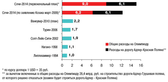 В марте 2009 года вице-премьер Дмитрий Козак объявил, что расходы на Олимпиаду вдруг неожиданным образом сократились до 218 млрд. рублей. Непонятно, входит ли в эту цифру сооружение инфраструктурных, энергетических и других сопутствующих объектов (пока изменения в официальную ФЦП не внесены, и официально действительна цифра в 314 млрд. рублей), однако даже новая цифра в 218 млрд. рублей в разы превосходит стандартную стоимость проведения Зимних Олимпийских игр. В озвученную Д.Козаком сумму в 218 млрд. рублей также явно не входят 242 млрд. рублей, предназначенных для строительства железной и автомобильной дорог Адлер - Красная Поляна.