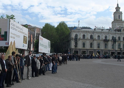 "Живая цепь" перед зданием "Банка Грузии" на площади Свободы. Тбилиси, 30 апреля 2010 года. Фото "Кавказского Узла"Лидер партии "За справедливую Грузию" Зураб Ногаидели отметил, что пока в стране будут политзаключенные, политические процессы и выборы не могут называться нормальными.