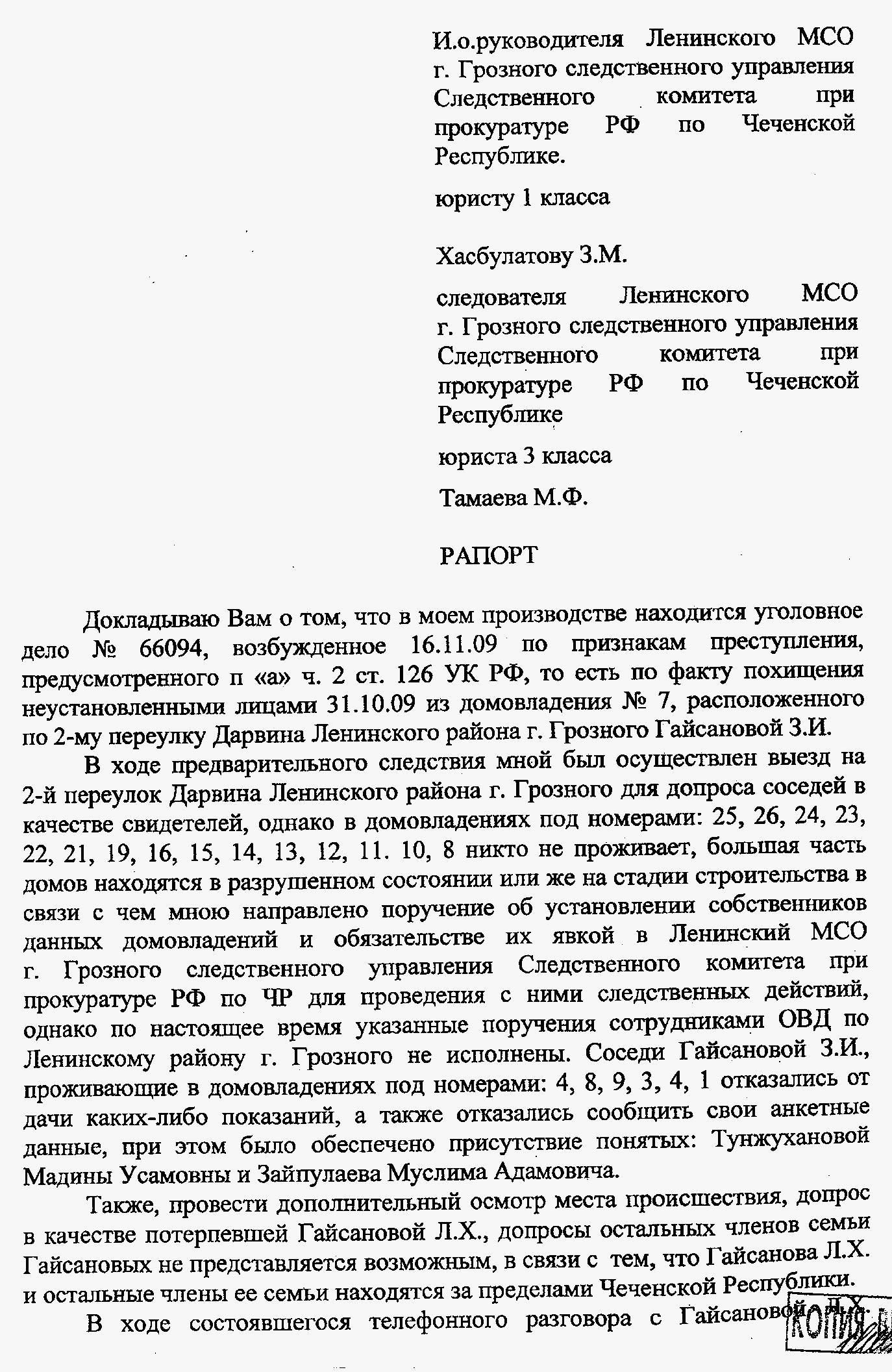 Похищения и исчезновения людей на Северном Кавказе в 2009 году, саботаж расследования уголовных дел в 2009 – 2010 годах. Доклад Правозащитного центра "Мемориал".