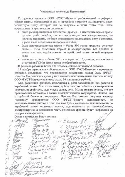 В приложении к данной статье - копия письма сотрудников РАФ "Новая жизнь" на имя А.Ткачева с подписями работников агрофирмы.
