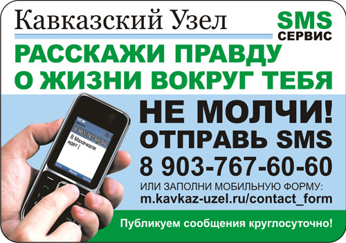 Если Вы стали очевидцем интересных или трагических событий, о которых должны знать обычные люди, представители общественности и власти, расскажите о них. Тысячи пользователей Интернета с помощью нового sms-сервиса на «Кавказском узле» могут не только узнать о жизни на Кавказе, но и помочь нуждающимся.