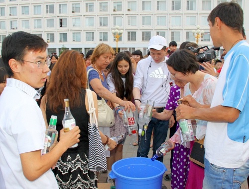 В завершение мероприятия горожане и гости Элисты публично вылили алкогольные напитки в специально приготовленные ведро и мешки с опилками.