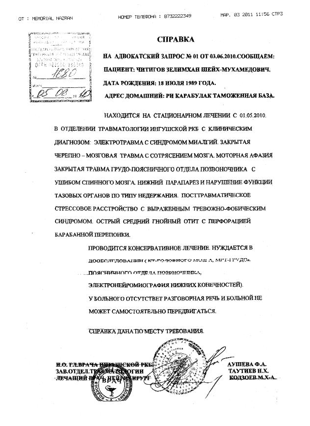 Нечего и говорить, что судебное заседание по делу, еще далекому от завершения, было отложено. Так Магомеду Хазбиеву и не удалось послушать свидетелей, которые видели Зелимхана после пыток. А было бы это нашему правозащитнику и борцу за правду весьма полезно. Он узнал бы, как в январе 2011 года Зелимхана Читигова привезли в Москву в инвалидной коляске с диагнозом, из которого следовало, что он никогда из нее не поднимется. Травма позвоночника, ушиб спинного мозга, посттравматическая киста головного мозга, перфорация барабанной перепонки и гнойный отит, тревожно-фобический синдром – и это не весь список последствий четырех дней общения молодого чеченца с теми, кто сейчас просит его изменить показания. «У больного отсутствует разговорная речь, и больной не может самостоятельно передвигаться» - гласила последняя фраза . Случилось чудо – врачи московской больницы имени Боткина поставили Зелимхана на ноги. Его речь и интеллектуальные способности полностью восстановились. Однако перенесенные пытки нанесли неисправимый вред его здоровью. И чтобы с другими не произошло того же, виновные в истязаниях должны быть наказаны.