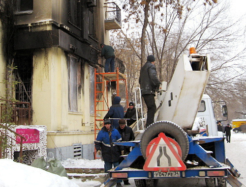 Рабочий ремонтирует фасад здания, пострадавшего от взрыва газового баллона в кафе "Белладжио". Волгоград, ул. Мира, 13, 16 февраля 2012 г. Фото Вячеслава Ященко для "Кавказского узла"По словам чиновника, "серьезно пострадало 7 квартир, 4 из которых находятся в муниципальном фонде". "Будет составлена смета и в дальнейшем сделан ремонт за счет средств резервного фонда", - сказал представитель горадминистрации. По его словам, пострадавший в результате пожара дом на улице Мира был первым, который построили после войны, и он "представляет известную историческую ценность", передает "Интерфакс".