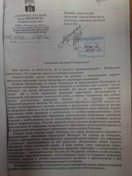 Ответ администрации Пятигорска на протест прокуратуры по поводу разрешения на строительство пансионата на западном склоне горы Машук