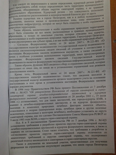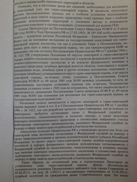 Ссылка Прокуратуры на Постановление Совета Министров РСФСР от 9 июля 11985 года №300 и Указ Президента РФ от 27.03.1992г. № 309 «Об особо охраняемом эколого-курортном регионе Российской Федерации - Кавказских Минеральных Водах» как на основание постановки на государственный кадастровый зон горно-санитарной охраны неуместна, так как в указанном Указе и Постановлении, во-первых, речь идет о зонах санитарной охраны, что для городов-курортов КМВ не применимо, так как согласно Постановлению Правительства РФ от 7 декабря 1996 г. № 1425 "Об утверждении Положения об округах санитарной и горно-санитарной охраны лечебно-оздоровительных местностей и курортов федерального значения в лечебно-оздоровительных местностях и на курортах федерального значения в комплексе природных лечебных факторов имеются объекты, относящиеся к недрам | (минеральные воды, лечебные грязи и другие полезные ископаемые, отнесенные к j категории лечебных) устанавливаются округа горно-санитарной охраны, а не округа санитарной охраны, во-вторых, точки, указанные в Постановлении Совета (министров РСФСР от 09 июля 1985 года №300 являлись условными, то есть не позволяющими достоверно установить границы зон, в-третьих, большинство указанных условных точек с 1985 года не сохранились, что также свидетельствует о невозможности применения Постановления Совета министров РСФСР от 09 июля 1985 года №300 как основания для постановки -зон горно-санитарной охраны на государственный кадастровый учет.