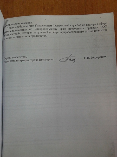 Также сообщаем, что Управлением Федеральной службой по надзору в сфере природопользования по Ставропольскому краю проводилась проверка ООО "Кавжилстрой», которая нарушений в сфере природоохранного законодательства не выявила. Копия акта прилагается.
