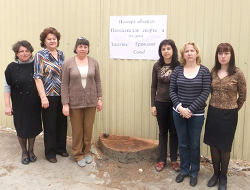 На строительном заборе, возведенном вокруг места строительства, участники пикета повесили свой альтернативный "паспорт объекта" и написали на нем: "Площадка для спорта и отдыха. Заказчики: граждане Сочи!".