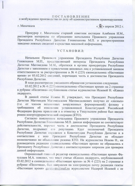 Начальник Правового управления Президента Республики Дагестан Генжеханов М.П., представляющий интересы Президента Республики Дагестан Магомедова М.М., обратился в органы прокуратуры Республики Дагестан с заявлением о привлечении виновных лиц к установленной законом ответственности за распространение в № 4 (223) еженедельника "Настоящее время" от 03.02.2012 сведений, порочащих честь и достоинство Президента Республики Дагестан.