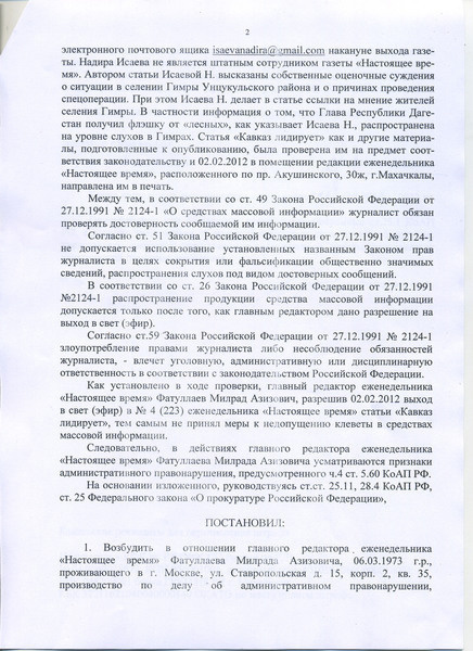 Как установлено в ходе проверки, главный редактор еженедельника "Настоящее время" Фатуллаев Милрад Азизович, разрешив 02.02.2012 выход в свет (эфир) в № 4 (223) еженедельника "Настоящее время" статьи "Кавказ лидирует", тем самым не принял меры к недопущению клеветы в средствах массовой информации.