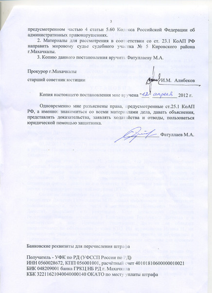 3. Копию данного постановления вручить Фатуллаеву М.А.