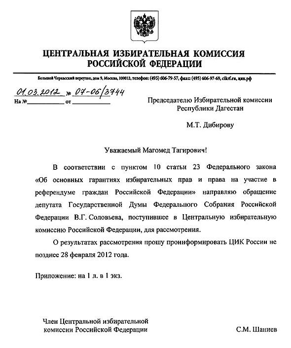 Ответ ЦИК РФ на обращение депутата Государственной Думы ФС РФ В.Г.Соловьева о якобы имевших место нарушениях избирательного законодательства в Республике Дагестан