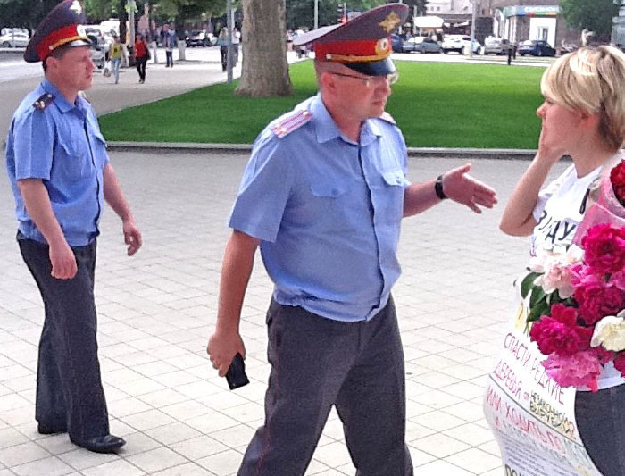 Евгения Чирикова во время пикета. Краснодар, 14 мая 2012 г. Фото Николая ЛяскинаКак сообщал "Кавказский узел", Чирикова была задержана в тот момент, когда в нескольких метрах от нее оказался краснодарский активист партии "Яблоко" Игорь Харченко. Полицейские заявили, что это массовое мероприятие и задержали обоих активистов.