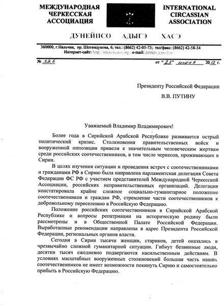 Обращение Международной черкесской ассоциации к Президенту РФ В.В. Путину