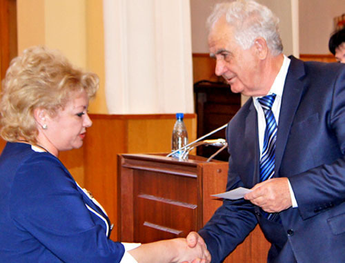 Константин Кадиев (справа) вручает мандат депутата Руслану Сабанову. Северная Осетия, Владикавказ, 23 октября 2012 г. Фото Дмитрия Тамерланова для "Кавказского узла"Председатель ЦИК Константин Кадиев вручил депутатские мандаты тем, кто прошел в парламент Северной Осетии пятого созыва от "Единой России" по партийным спискам. Среди них – Сослан Андиев, Людмила Токаева, Станислав Кесаев, Тамара Таболова, Джамбулад Базаев, Александр Реутов, Ахсарбек Гулаев, Ушанги Сакаев, Руслан Течиев, Игорь Гусиев, Руслан Сабанов, которые работали в законодательном органе с 2007 по 2012 годы.
