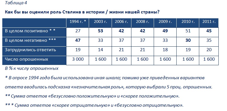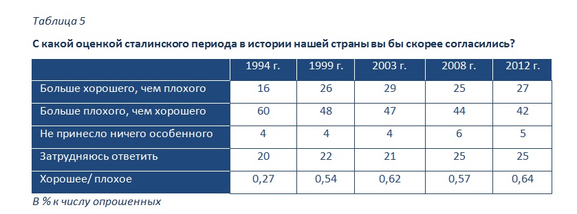 Увеличение числа россиян, позитивно оценивающих заслуги Сталина, не означает роста человеческих симпатий к нему или реставрации тоталитарных установок, хотя соблазн таких интерпретаций велик. Оценки сталинизма и сталинской эпохи двоятся: "историческая роль" Сталина стала котироваться в общественном мнении выше (см. таблицу 4), а восприятие того времени, помеченного его именем, сохраняет негативные коннотации, хотя и все с меньшей силой (см. таблицу 5 и 6).