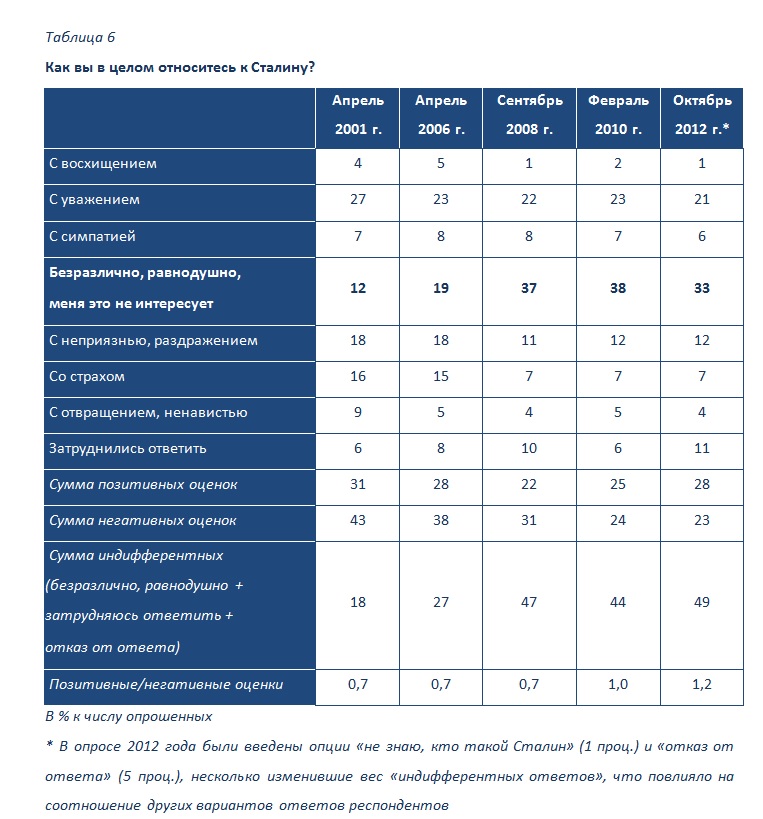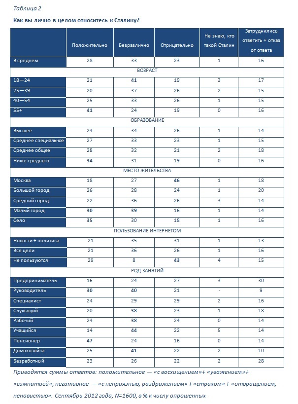 Почти четверть опрошенных молодых людей (от 18 до 30 лет) характеризует свое отношение к Сталину как равнодушное, и еще почти треть или отказывается отвечать на этот вопрос (3 проц.), или не знает, как ответить (16 проц.), или говорит, что не знает, кто такой Сталин (10 проц.). Большая доля ответов "не знаю" среди молодых людей говорит об их равнодушии к Сталину и истории того периода.