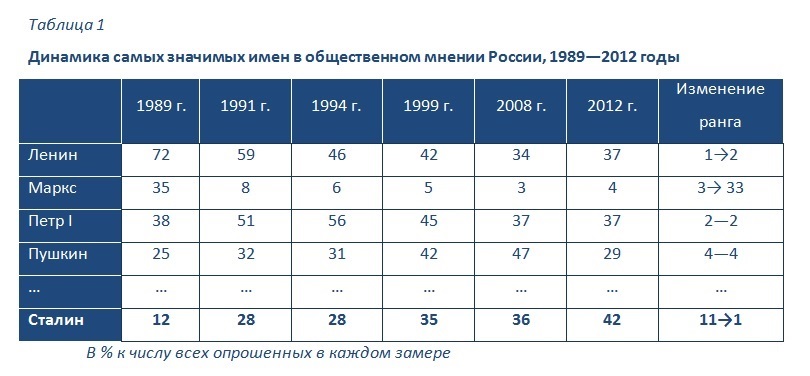 Забальзамированный Ленин по-прежнему выставлен в Мавзолее, который сохраняет торжественно-мрачную атмосферу почитания большевистского вождя. Именем Ленина по-прежнему названы улицы и площади российских городов, его памятники стоят по всей России, но память о вожде мирового пролетариата и основателе советского государства постепенно тускнеет. Тем временем Сталин в восприятии россиян за постсоветские годы постепенно дорос до статуса самого выдающегося общественного деятеля, "оказавшего наиболее значительное влияние на мировую историю" (см. таблицу 1 в статье Льва Гудкова в этом сборнике), несмотря на то, что его образ практически отсутствует в физическом публичном пространстве. Путешествующему по России нипочем не догадаться, кого россияне считают своим главным героем. В стране практически нет ни памятников, ни портретов Сталина, его именем не названы ни улицы, ни заводы. Статус "секретного героя" отражает сущностную неопределенность, свойственную постсоветской государственной идентичности России. Общественное восприятие Сталина противоречиво, а официальный дискурс уклончив и двусмыслен. Хотя Сталин не присутствует в физическом пространстве страны, наследие сталинизма явственно ощущается в нынешнем российском политическом порядке и в отношениях между государством и обществом.