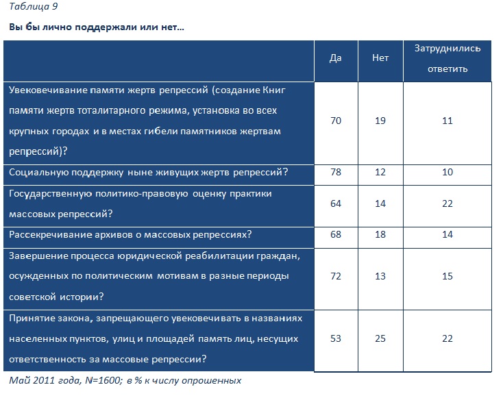 Поэтому абсолютное большинство россиян не испытывают затруднений, отвечая на вопрос: нужна ли "программа десталинизации"? Все без исключения пункты этой программы признаются российским обществом как необходимые, а сама программа как давно назревшая (см. таблицу 9).