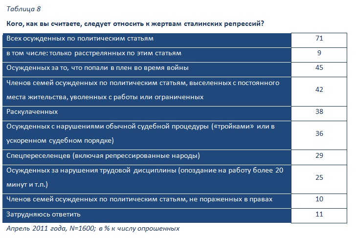 Для общественного мнения гораздо важнее в функциональном плане тезис о том, что репрессии были тотальными и социально ненаправленными, что они охватывали все категории населения и социальные группы. (Иначе невозможно удержать тезис об иррациональности террора.) Поэтому на вопрос (апрель 2011 года): "Кто, на ваш взгляд, подвергался репрессиям в 1937—1938 годах?" — лишь 11 проц. заявили: "те, кто был явно или скрыто настроен против Советской власти", еще 8 проц. — "наиболее преданные сторонники советской власти", 23 проц. дали ответ "наиболее способные и авторитетные люди", но относительное большинство — 48 проц. опрошенных сказали: "все без разбора, по произволу властей или доносам". Иначе говоря, преступления советской власти совершались, по мнению бóльшей части населения, именно против всего народа, а не против какой-то отдельной группы; жертва — народ в целом. При этом важно, что массовое сознание не склонно относить к пострадавшим от репрессий только тех, кто попал в эту мясорубку лишь в годы большого террора; люди в массе своей понимают репрессии гораздо шире, включая сюда и военнопленных, и раскулаченных, и спецпереселенцев, и членов семей репрессированных (см. таблицу 8).