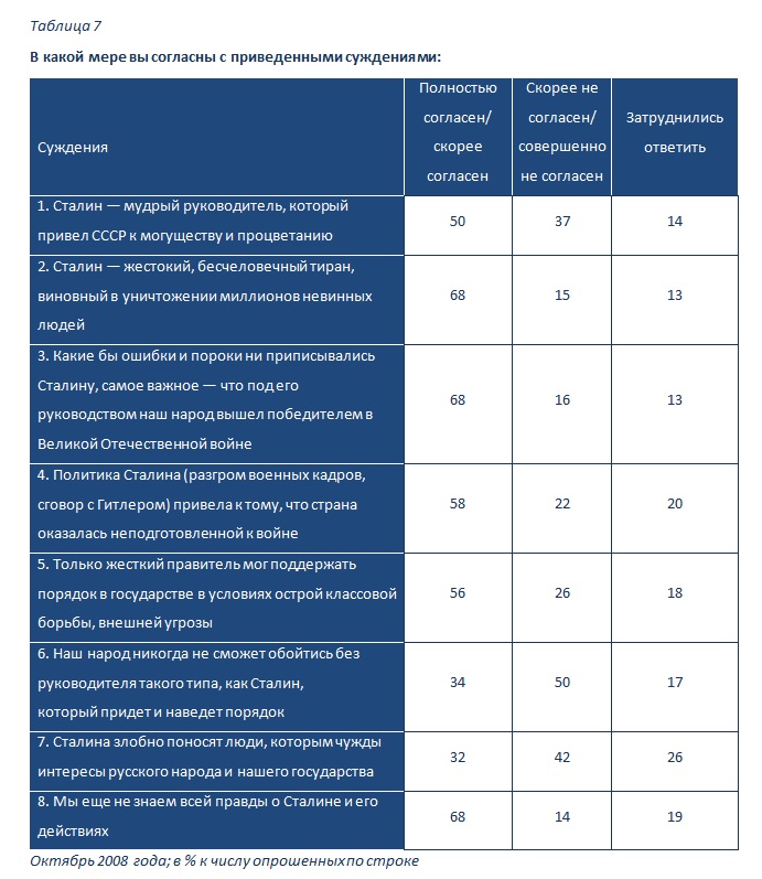 Сама эта двойственность, кажущаяся алогичной, не случайна. Как показывает анализ данных, одни и те же люди говорят, что Сталин — тиран, виновный в смерти миллионов людей и что только под его руководством СССР превратился в могущественную и процветающую державу; что политика Сталина привела к разгрому военных кадров и неготовности страны к войне и что только под руководством Сталина наш народ вышел победителем в этой войне (см. таблицу 7). Подобное, многократно повторяющееся в социологических исследованиях соединение не просто разных, а "несовместимых" мнений указывает, что это не социологический артефакт или ошибка методики опросов, не "шизофрения массового сознания", каковой часто его готовы считать многие наблюдатели, а действие специфических механизмов "двоемыслия", определяющих тоталитарное и — в меньшей степени — посттоталитарное сознание.