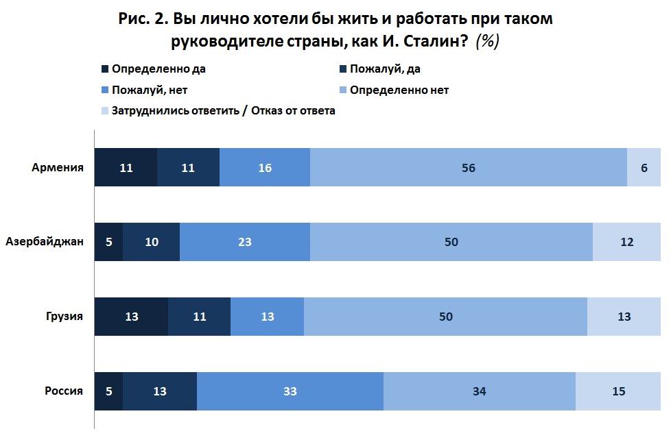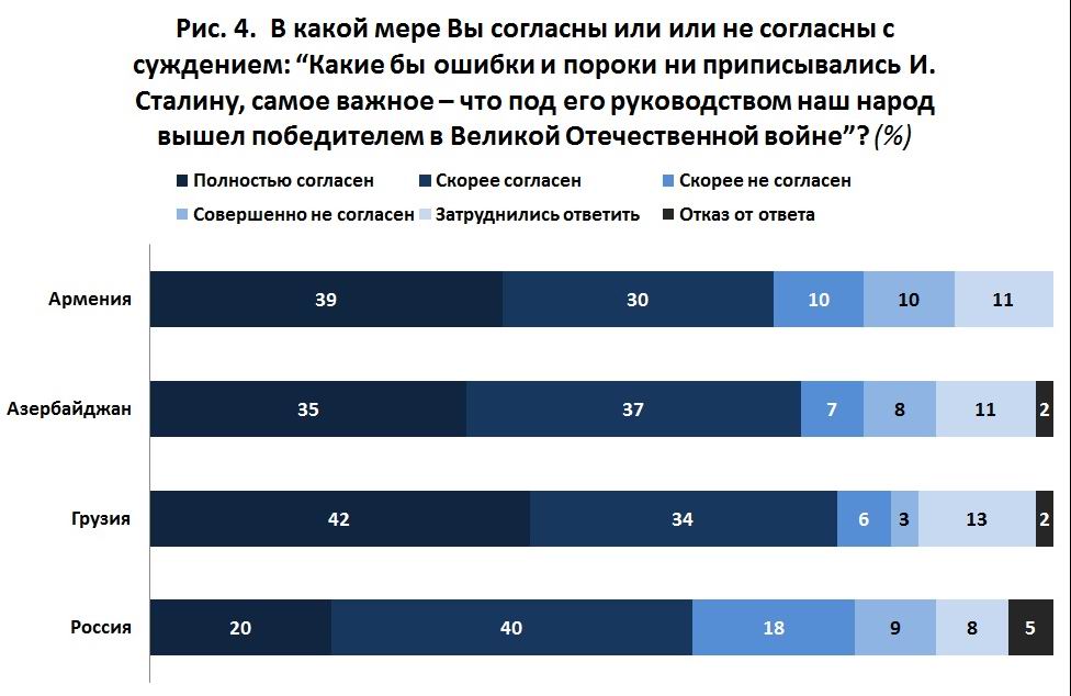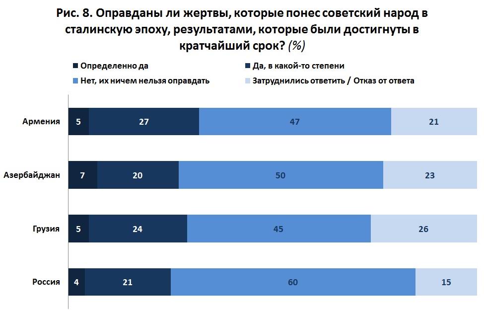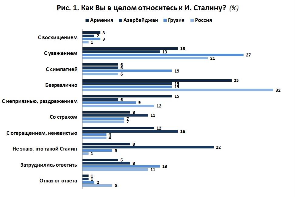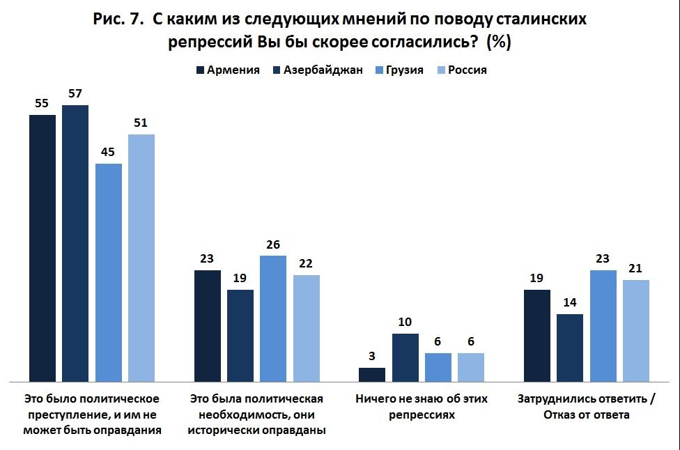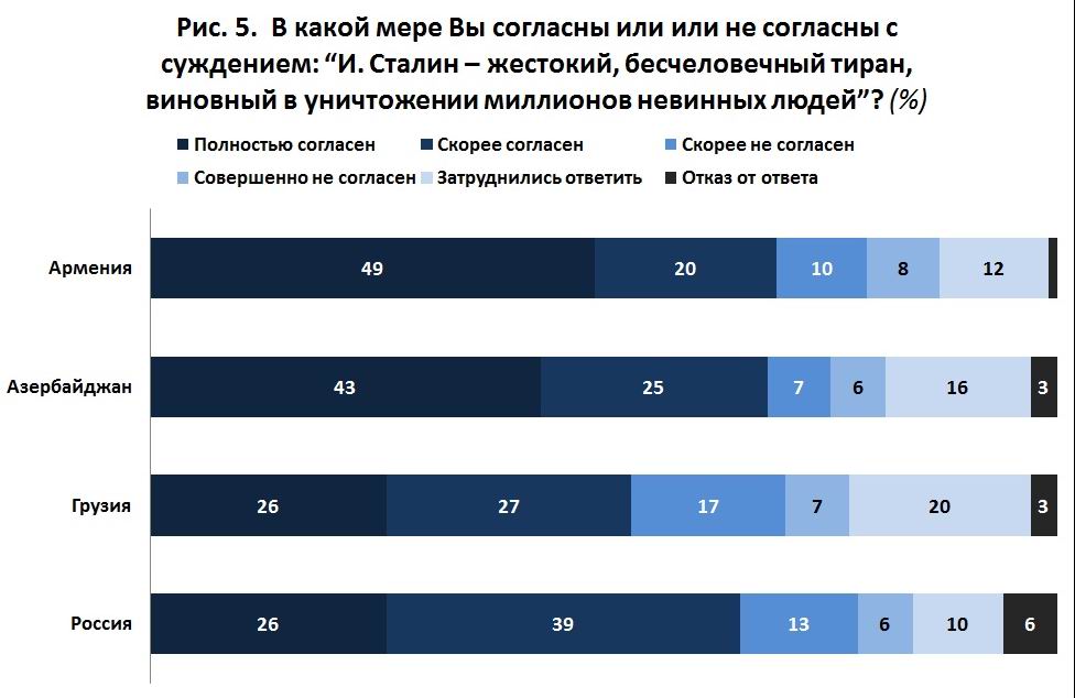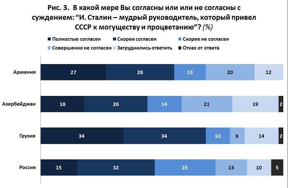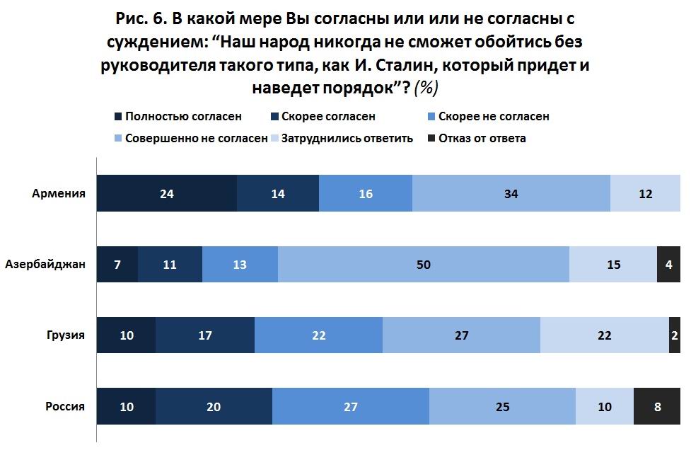 Несмотря на менее откровенные симпатии к Сталину, в Азербайджане и Армении, где мифологизированная эмоциональная связь со Сталиным гораздо слабее, чем в Грузии и России, все же достаточно высока доля положительных оценок его деятельности. Однако самый удивительный результат — в азербайджанских данных, согласно которым 22 проц. всех опрошенных (и 39 проц. молодых) заявляют, что не знают, кто такой Сталин.