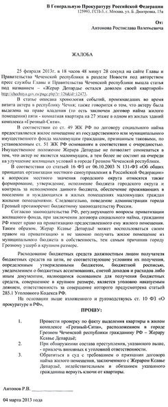 Жалоба Р.Антонова в Генпрокуратуру РФ по факту выделения Р.Кадыровым квартиры в г.Грозном Ж.Депардье