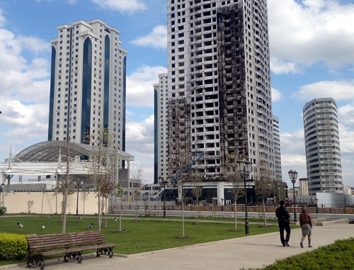 Строительные рабочие завершают работу по очистке фасада сгоревшего 3 апреля высотного здания комплекса "Грозный-Сити". Работы проводились с помощью техсредств, поступивших из Турции. Многие жители города высказывают удовлетворение, что пострадавшее здание очищено от сгоревшей обшивки в такой короткий срок. Приоритетными версиями пожара в МВД называют замыкание и неправильные действия строителей, а эксперты считают, что причиной пожара стали недоработки в конструкции здания и использование некачественных отделочных материалов.