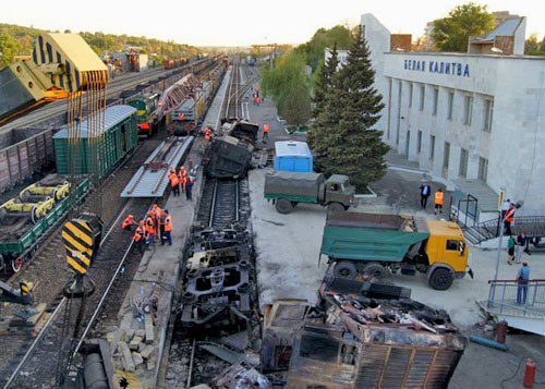 Сегодня по состоянию на 9:00 мск из 51 поврежденного вагона с места происшествия убрано 38 вагонов, из 3060 тонн металлолома 2280 тонн.