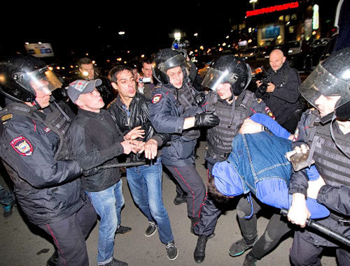 Примерно в 19.00 около 100 человек, собравшихся перед метро "Пражская", начали движение в сторону Бирюлево, нарушая общественный порядок. Наиболее активных молодых людей стали задерживать сотрудники ОМОНа. Остальные рассеялись по близлежащим дворам, сообщает РИА "Новости".
