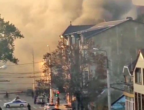 На месте взрыва возник пожар. Огонь перекинулся на соседние магазины и кафе. На улице перекрыт газ, работают пожарные, сообщает ИТАР-ТАСС.