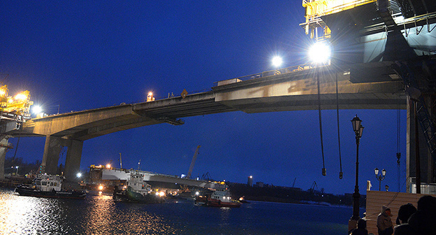 Подъем начнется, как только позволит погода, штатное время подъема пролета составляет четыре часа, проинформировал Голошивец. "Строительство ведется с опережением графика. Сегодня мы уже выполняем объем работ, намеченный на лето следующего года. Если удастся сохранить такие темпы, то в июне 2015 года мы сдадим мост в эксплуатацию", - сказал он.