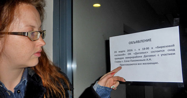 24 марта с 18.00 до 19.30 в здании оздоровительного комплекса "Дагомыс" проходило мероприятие с участием Пахомова. Оно анонсировалось как "сход граждан" - соответствующее объявление с приглашением всех желающих было вывешено в оздоровительном комплексе, сообщила корреспонденту "Кавказского узла" секретарь совета ТОС "Дагомыс" Екатерина Шурманова.