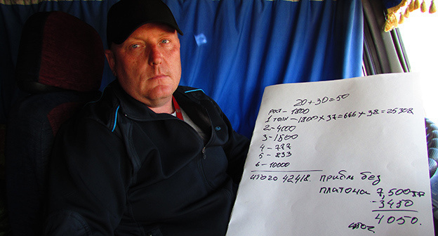 "Хотел, чтобы сын занимался - он четыре года провел в кабине. Ввели "Платон", ударили по рукам молодежи. Как дальше работать? Я домой приношу зарплату по 10 тысяч рублей. Да меня из дому скоро выгонят! А ему, молодому, каково?" - сказал Владимир Ерохин "Кавказскому узлу".