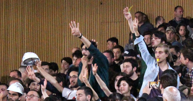 Несколько десятков молодых людей в Большом концертном зале в Тбилиси выражают протест против гибели четырех шахтеров. Они кричат и свистят, поднимая каски и четыре пальца - по числу погибших шахтеров. Начало всенародного рассмотрения проекта конституционных поправок было запланировано на 11.00 мск, однако оно все еще не началось в связи с протестом, передает корреспондент "Кавказского узла" в 11.31 мск.