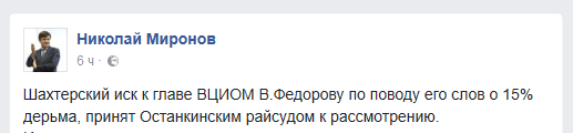 Как писал "Кавказский узел", 27 июля стало известно, что Останкинский райсуд Москвы принял к рассмотрению иск ростовских шахтеров к Валерию Федорову. Об этом сообщил руководитель Центра экономических и политических реформ Николай Миронов.
