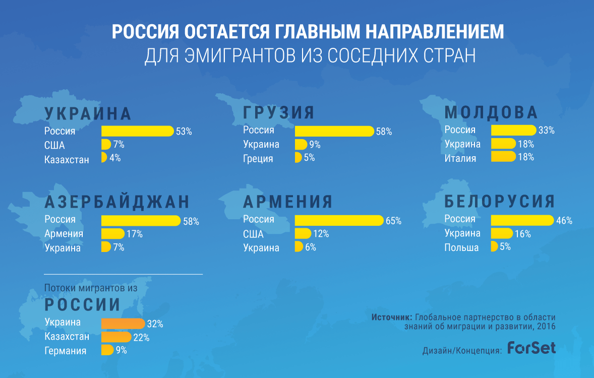 По данным на 2016 год, в эмиграции живет 26,3% населения Армении, 16,6% населения Грузии и 13,7% — Азербайджана. Что касается России, то по сравнению с Закавказьем в пропорциональном отношении отток людей здесь имеет меньший размах. За пределами страны живет только 7,6% россиян 1.