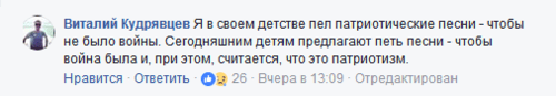 "Я в своем детстве пел патриотические песни - чтобы не было войны. Сегодняшним детям предлагают петь песни - чтобы война была и при этом считается, что это патриотизм", - написал в комментарии к записи Алексея Навального пользователь соцсети Facebook Виталий Кудрявцев.