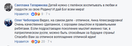 "Видео на самом деле отличное, Анна Александровна! Очень качественно сделанное, с хорошим смыслом и правильными ребятами. Если подрастающее поколение мыслит именно так, в патриотическом русле, можно быть спокойным за будущее страны! Спасибо Вам за отличное воплощение отличной идеи!" - заявил Олег Чеботарев.
