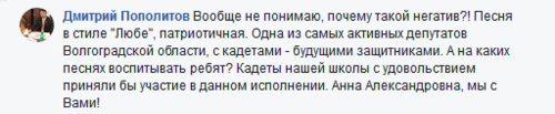 "Вообще не понимаю, почему такой негатив?! Песня в стиле "Любэ", патриотичная. Одна из самых активных депутатов Волгоградской области с кадетами - будущими защитниками. А на каких песнях воспитывать ребят? Кадеты нашей школы с удовольствием приняли бы участие в данном исполнении. Анна Александровна, мы с Вами!" - написал Дмитрий Пополитов.