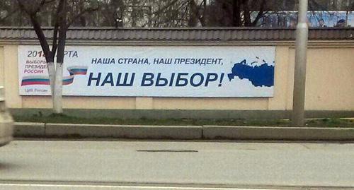 В Чечне активно работают доверенные лица Владимира Путина, в то время как представители других кандидатов в президенты России не проявляют практически никакой активности. По состоянию на 28 февраля, на улицах Грозного и других крупных населенных пунктов не было ни одного плаката или баннера кандидатов, кроме агитационных материалов в поддержку действующего президента России, передает корреспондент "Кавказского узла".