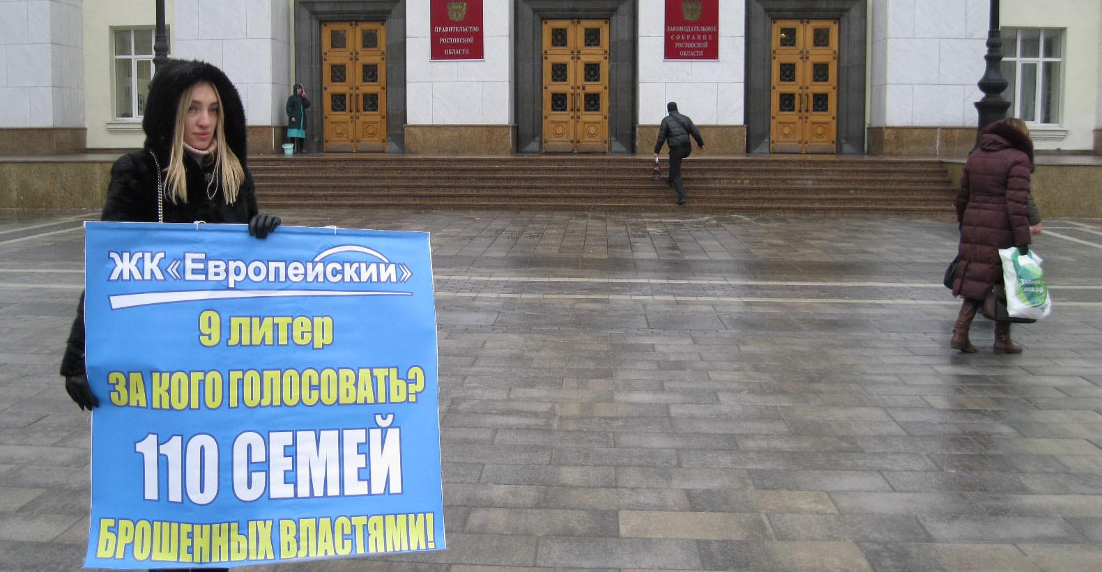 Как писал "Кавказский узел", дольщики ЖК "Европейский" неоднократно участвовали в акциях протеста в Ростове-на-Дону. 8 декабря 2016 года власти региона сообщили, что дом № 9 в ЖК "Европейский" будет сдан к концу января 2017 года, однако этого не произошло. В июне 2017 года дольщики ЖК "Европейский" попросили помощи у президента.