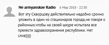 "Вот эту Скворцову действительно надобно срочно уложить в один из стационаров города,не говоря о районных.чтобы на своей шкуре испытала все прелести здравоохранения республики", - написал читатель под ником Ne armyanskoe Radio.