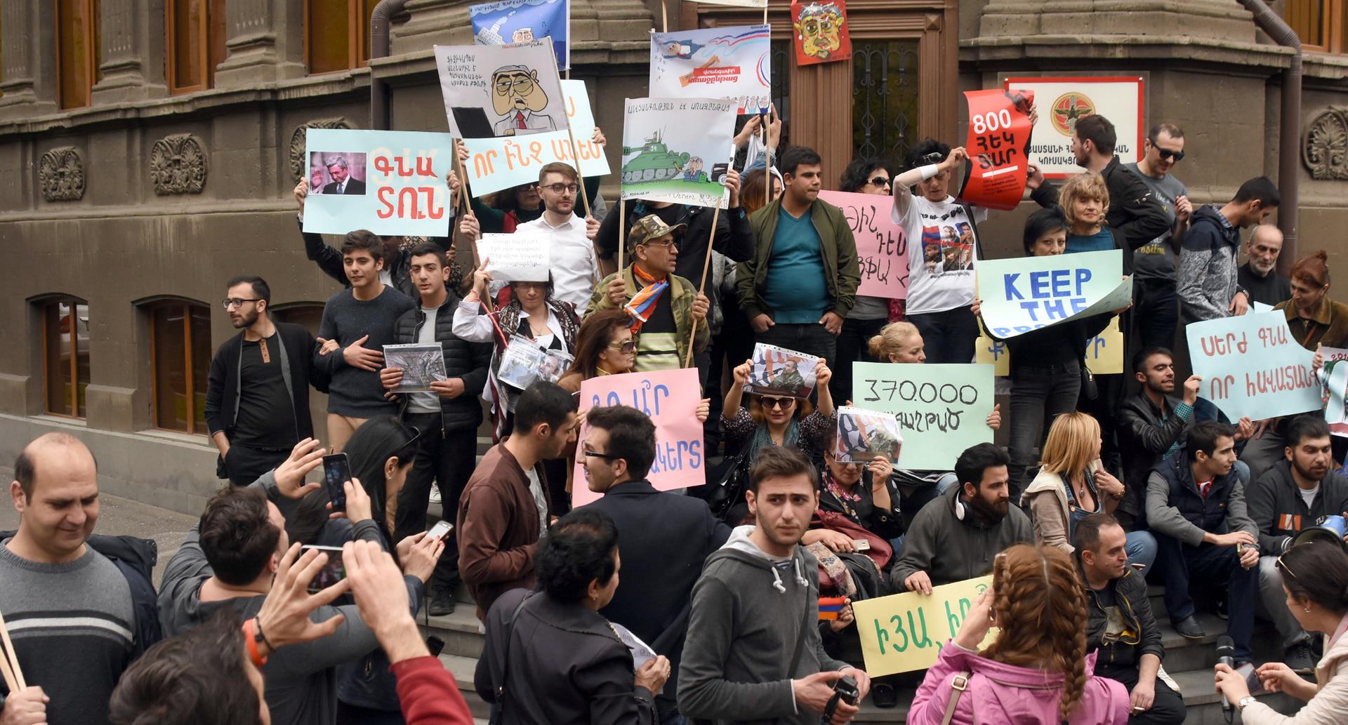 Активисты повесили над входом в офис РПА карикатуру президента Сержа Саргсяна, а также разместили на ступеньках плакаты с требованием к Саргсяну "не претендовать на власть". Участники акции скандировали "Серж, уходи!" и "Говорим – нет республиканцам!". Еще спустя 15 минут активисты продолжили шествие, которое завершилось без инцидентов и задержаний на Площади Свободы, передает корреспондент "Кавказского узла".