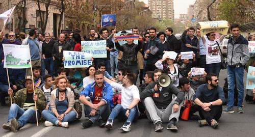 Около десятка активистов в Ереване сели на дорогу, призывая водителей автомобилей присоединиться к протестному движению против назначения Сержа Саргсяна премьер-министром Армении. Акция завершилась без инцидентов, передает корреспондент "Кавказского узла".