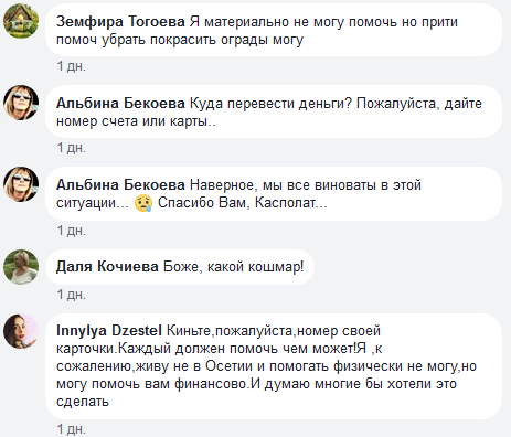 "Просьба сообщить, куда перечислить средства, я слышала об этом человеке, который живет на кладбище, ухаживает за могилами детей, я думаю многие поддержат нас,но руководству района и республики нужно решить эту создавшуюся ситуацию", - написала Светлана Кесаева.
