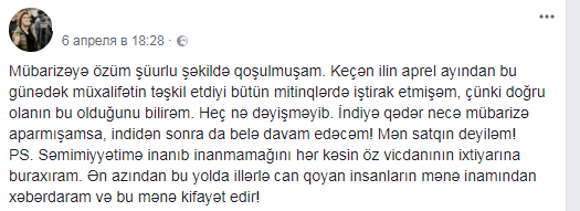 Сама Фатима и ее мать оказались недоступны для комментариев, но в своих сообщениях в Facebook девушка заявляет о своем намерении продолжать политическую борьбу, передает корреспондент "Кавказского узла", который перевел слова активистки с азербайджанского на русский язык.