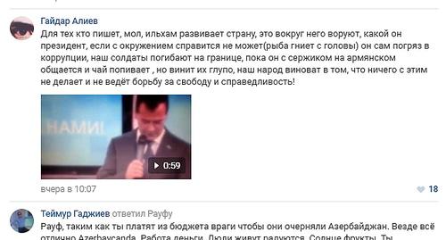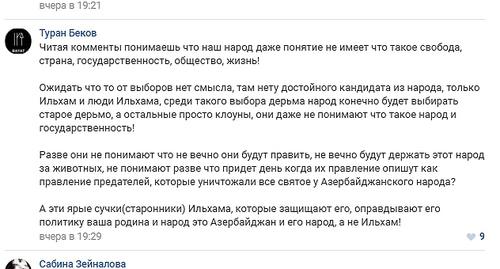 "Ильхам самый лучший президент. При нем Азербайджан развивается. Евроигры, Евровидение. Какой город конфетка стал. Flame Towers - украшение города. В городе много иномарок дорогих. Одежда бакинцев красивая. Деньги у миллятя есть. Ходят в кафе, рестораны. Ильхаму спасибо завтра за это надо сказать, придя на участок, и голос дать", - написал пользователь Теймур Гаджиев.