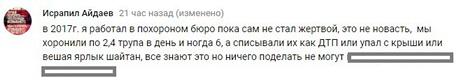 «В 2017 г. я работал в похоронном бюро, пока сам не стал жертвой, это не новость, мы хоронили по 2-4 трупа в день, иногда 6, а списывали их как ДТП или [что] упал с крыши или вешая ярлык «шайтан», - сообщил Исрапил Айдаев.