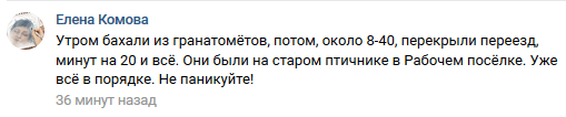 "Утром бахали из гранатомётов, потом, около 08.40, перекрыли переезд минут на 20 и всё. Они были на старом птичнике в Рабочем посёлке. Уже всё в порядке. Не паникуйте!" – успокоила пользователей соцсети Елена Комова.